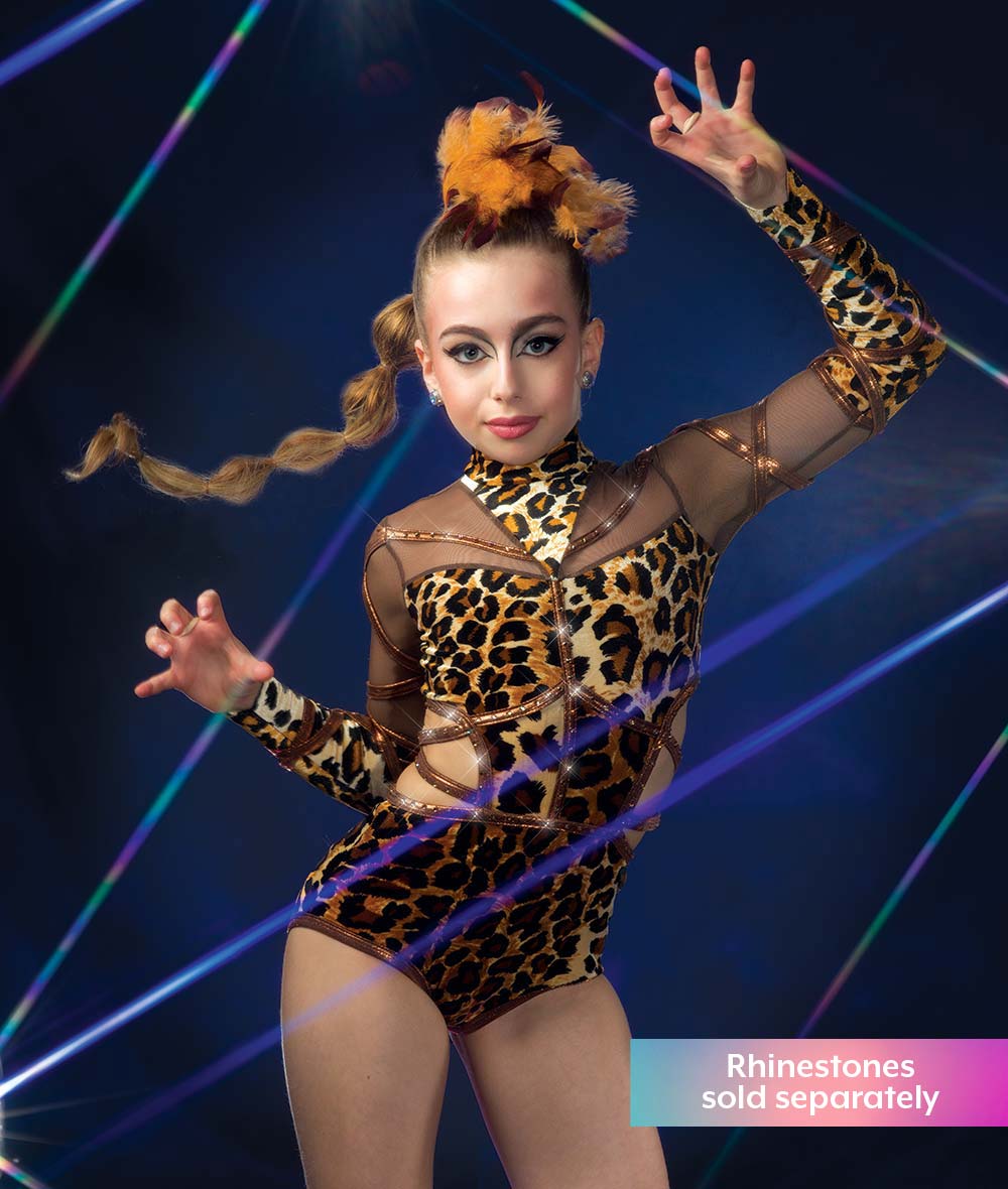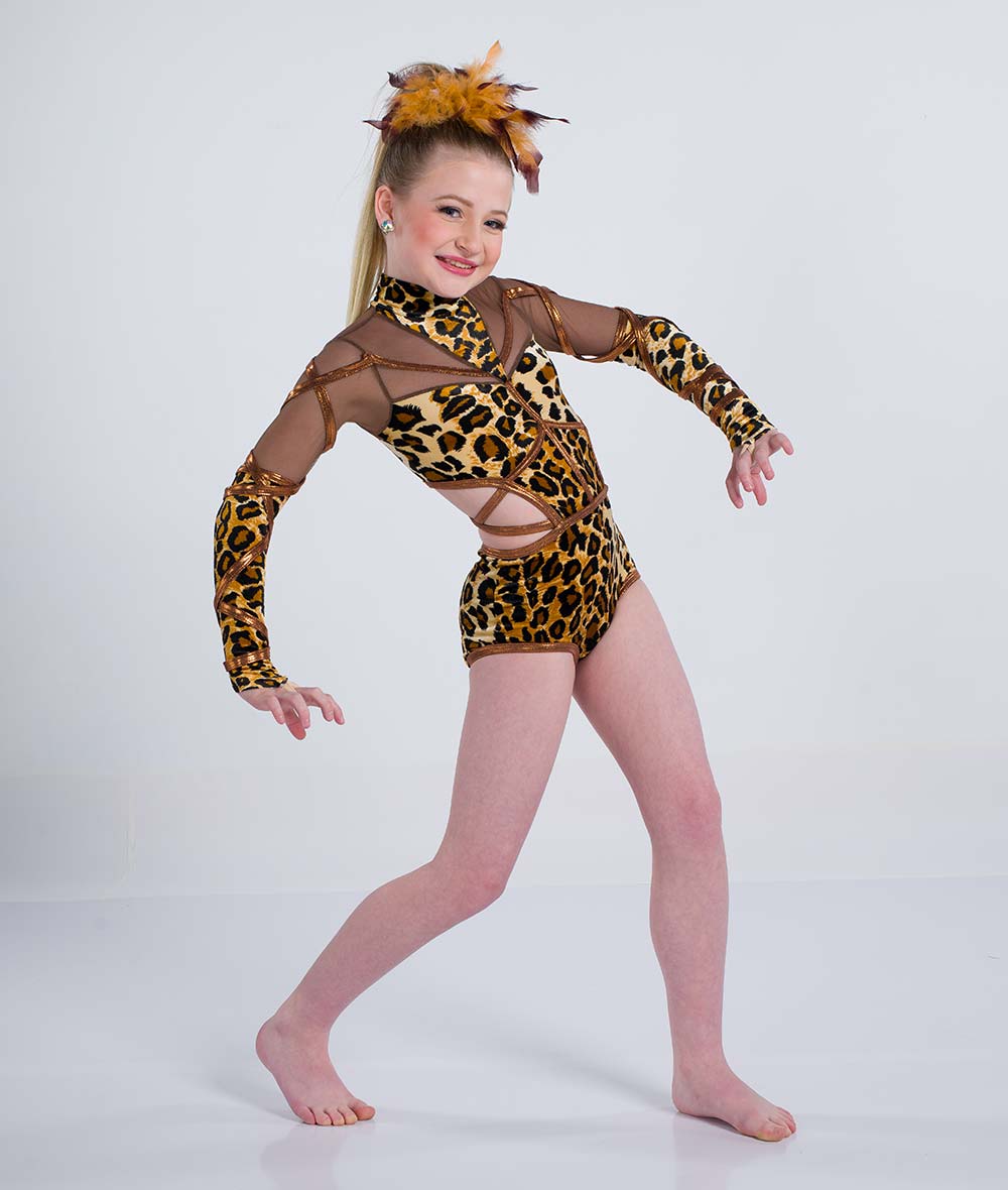 Cheetah print velvet and mesh long sleeve leotard with foil lycra trim, midriff cutout, and twirl panty. Made in the USA.