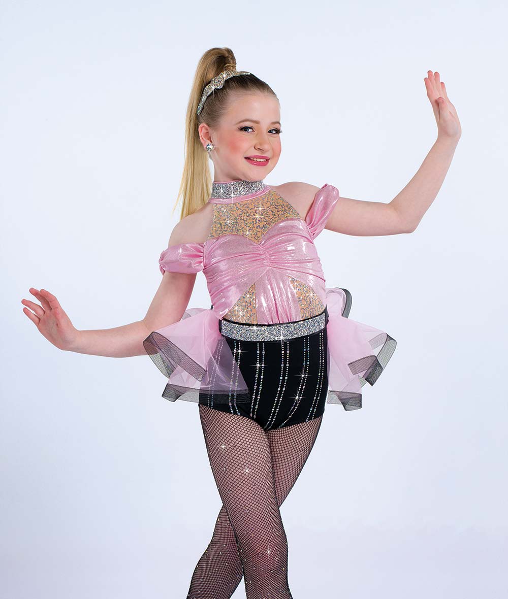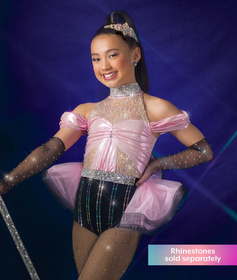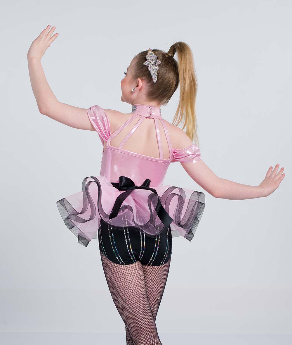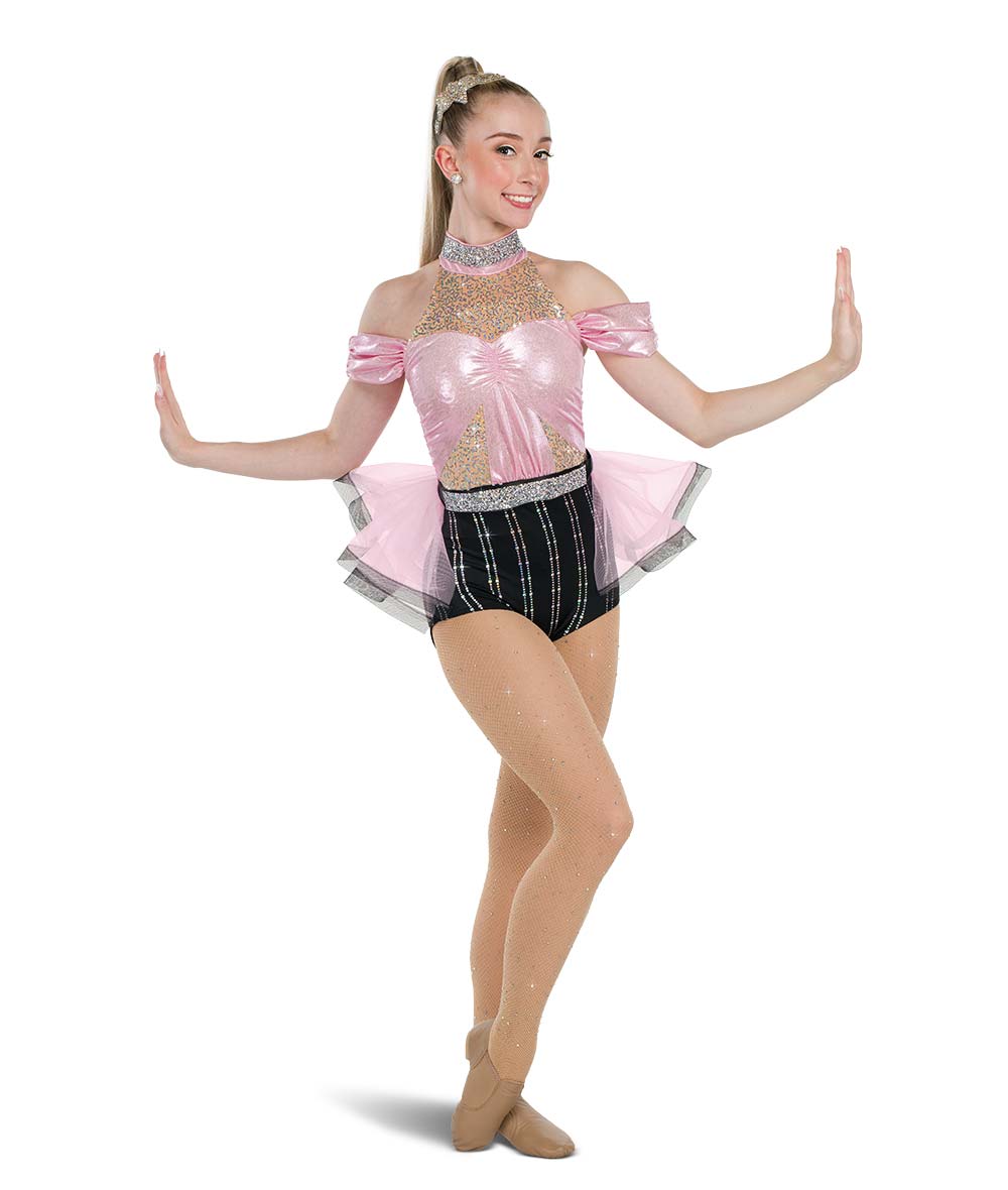 Lined sequin spandex, foil lycra, and foil pinstripe spandex leotard with rhinestone choker and twirl panty. Attached organza back bustle with horsehair trim. Made in the USA.