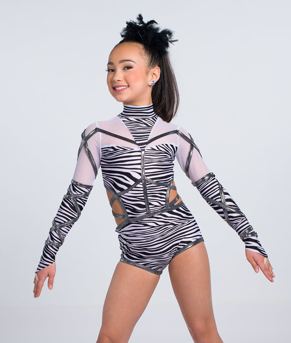 Zebra print spandex and mesh long sleeve leotard with foil lycra trim, midriff cutout and twirl panty. Made in the USA.
