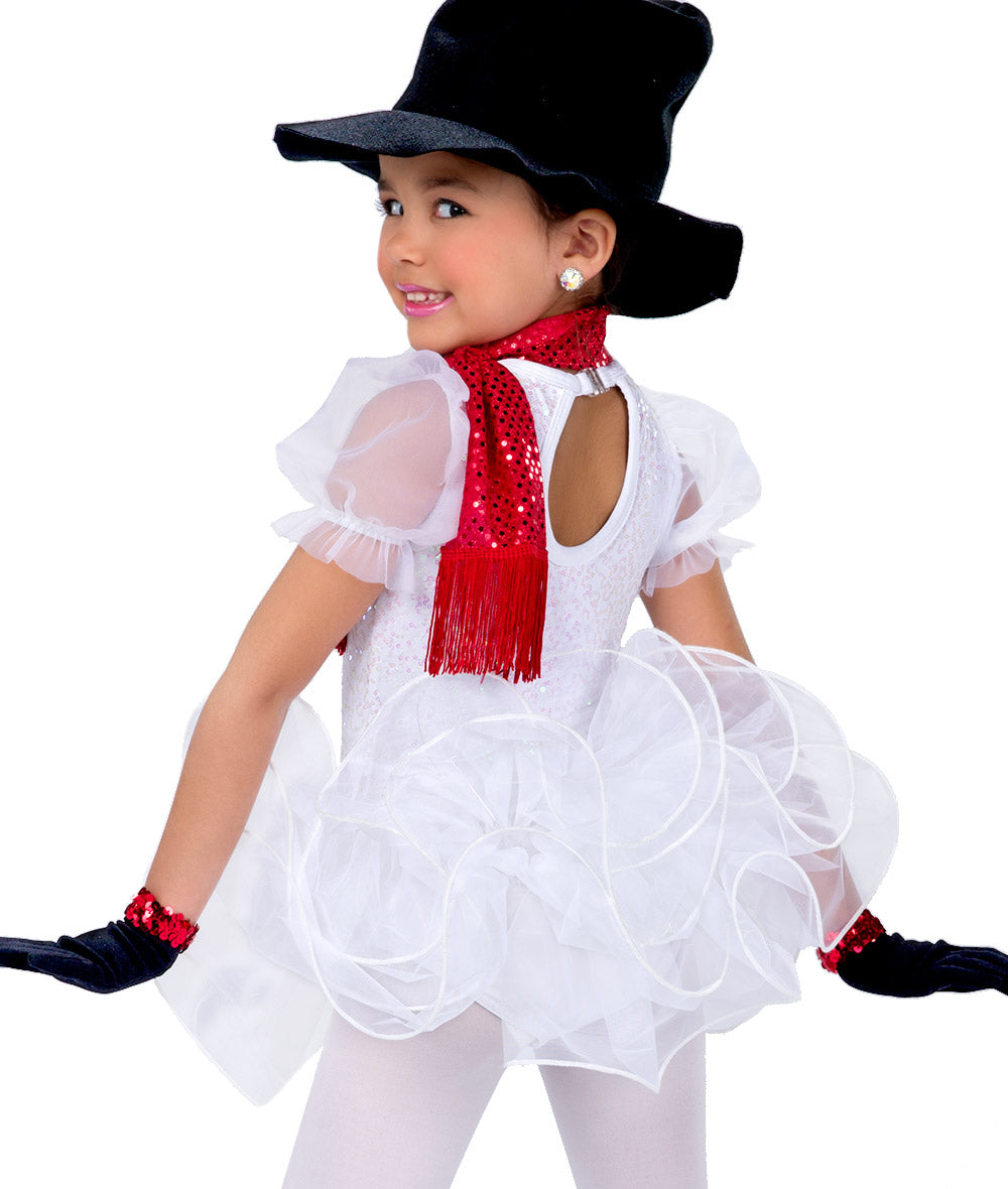 A layered organza tutu with monofilament curly hem adds volume and flair, while the included red sequin scarf and classic snowman top hat complete the festive performance look. Perfect for Christmas dance recitals, holiday shows, or any winter-themed stage performance, this costume will make your little dancer sparkle like fresh snow.