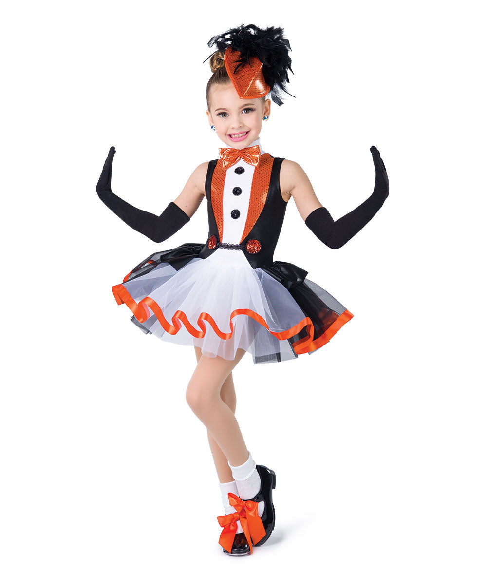 Bring stage charm and playful elegance to life with the H566Y Penguin Dance, a stunning girls' tuxedo-style dance costume with a delightful penguin flair. This eye-catching look features a foil lycra and spandex leotard with sparkly sequin dot foil insets, complete with attached black sequin buttons and a glimmering orange foil bow tie for that classic tuxedo vibe.