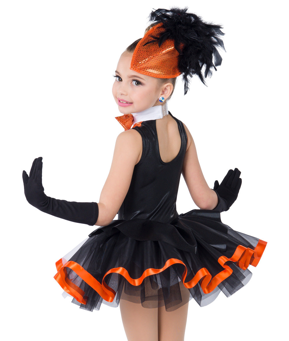 The attached two-tone organza tutu, trimmed with vibrant ribbon, adds volume and flair, making it ideal for tap, jazz, or themed penguin dance performances. Topped with a fun and fabulous feathered hat, this costume guarantees smiles on stage and in the audience.