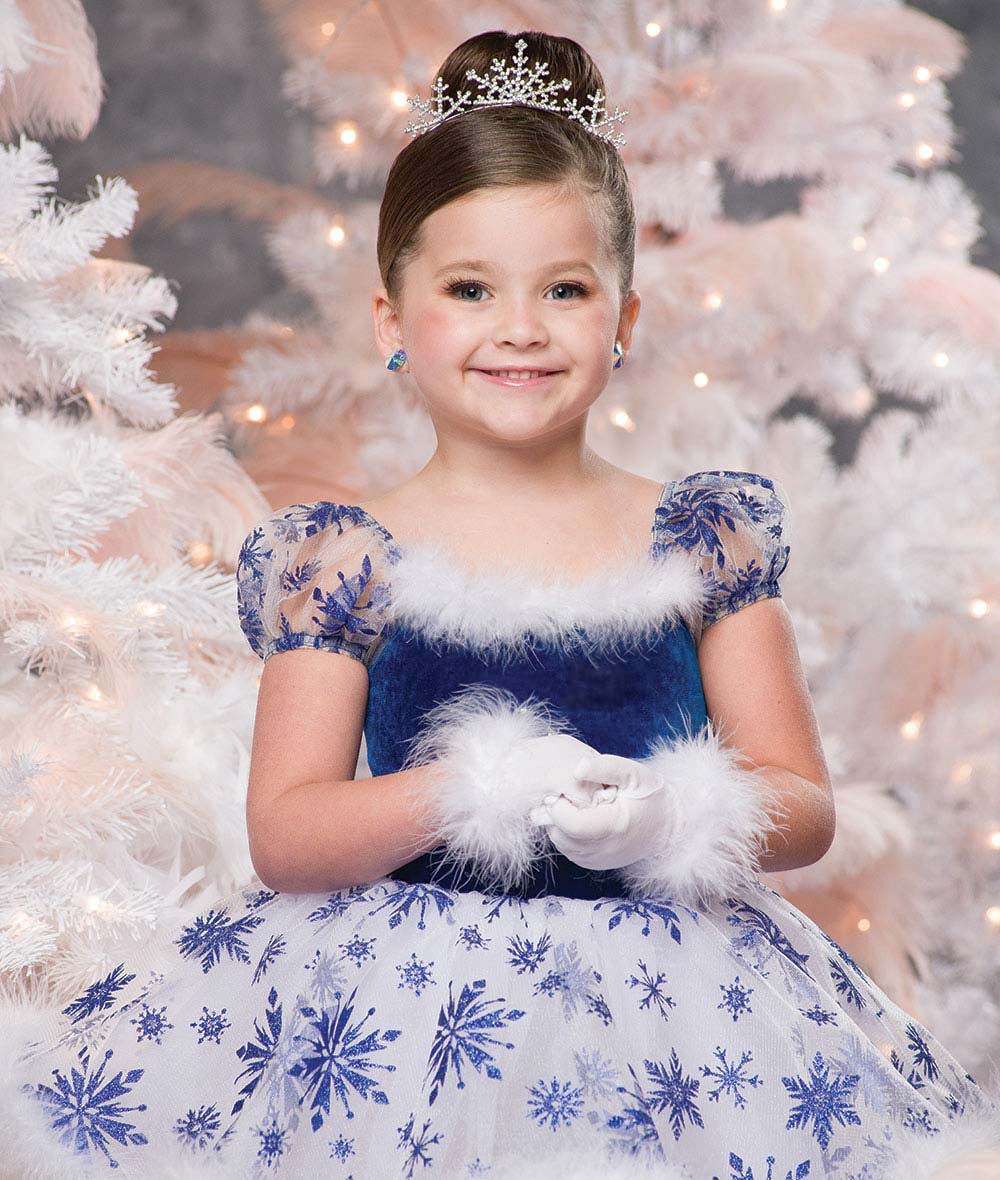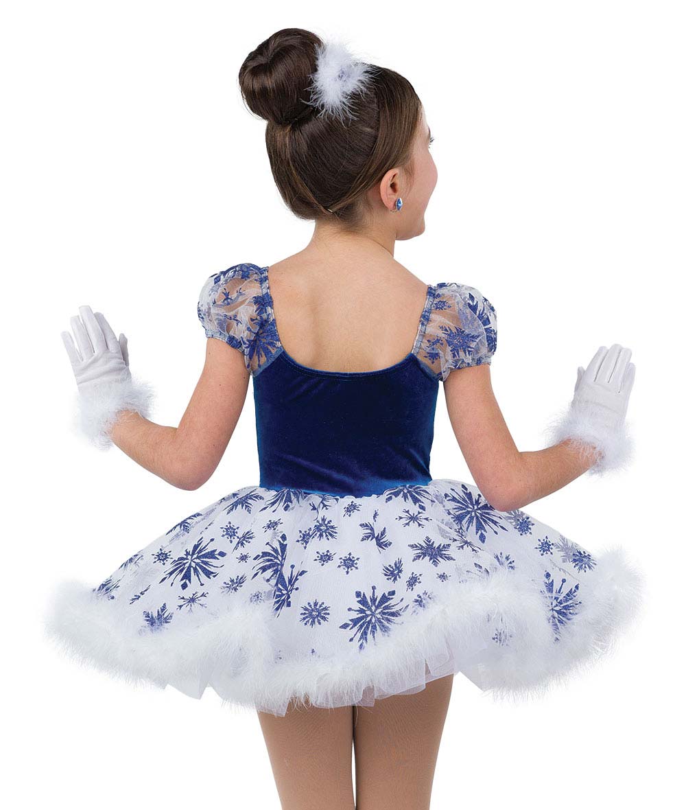 Velvet and spandex leotard with glitter snowflake tulle topskirt and sleeves. Attached marabou trim and organza crinoline. Made in the USA.
