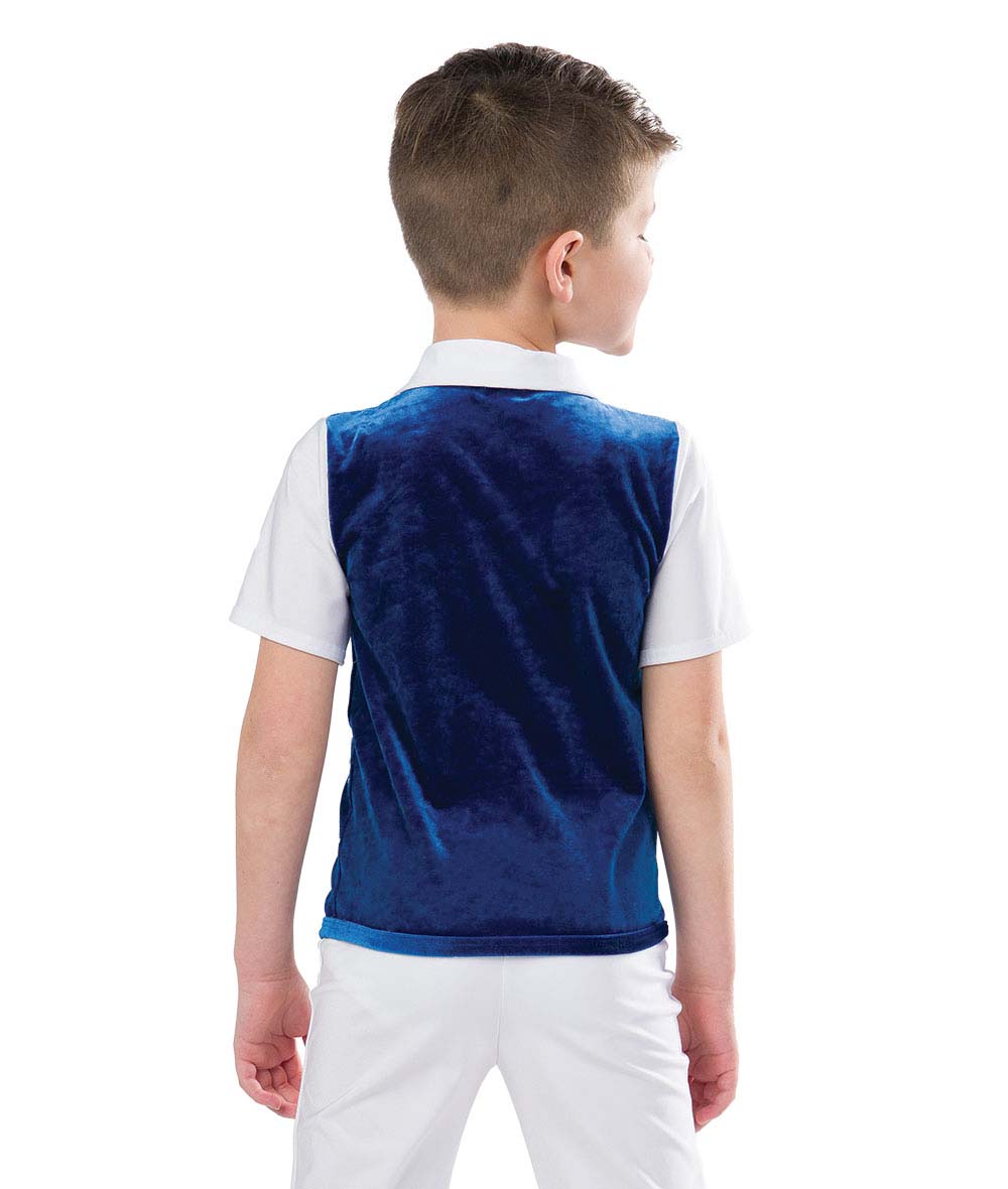 Bring a touch of winter charm to your holiday performance with the H609N Little Snowflake Boy Top, a festive and polished boy’s holiday dance costume top. This stylish piece features a short-sleeved spandex shirt with a crisp white collar, layered with a royal blue velvet vest for a dressed-up winter look.