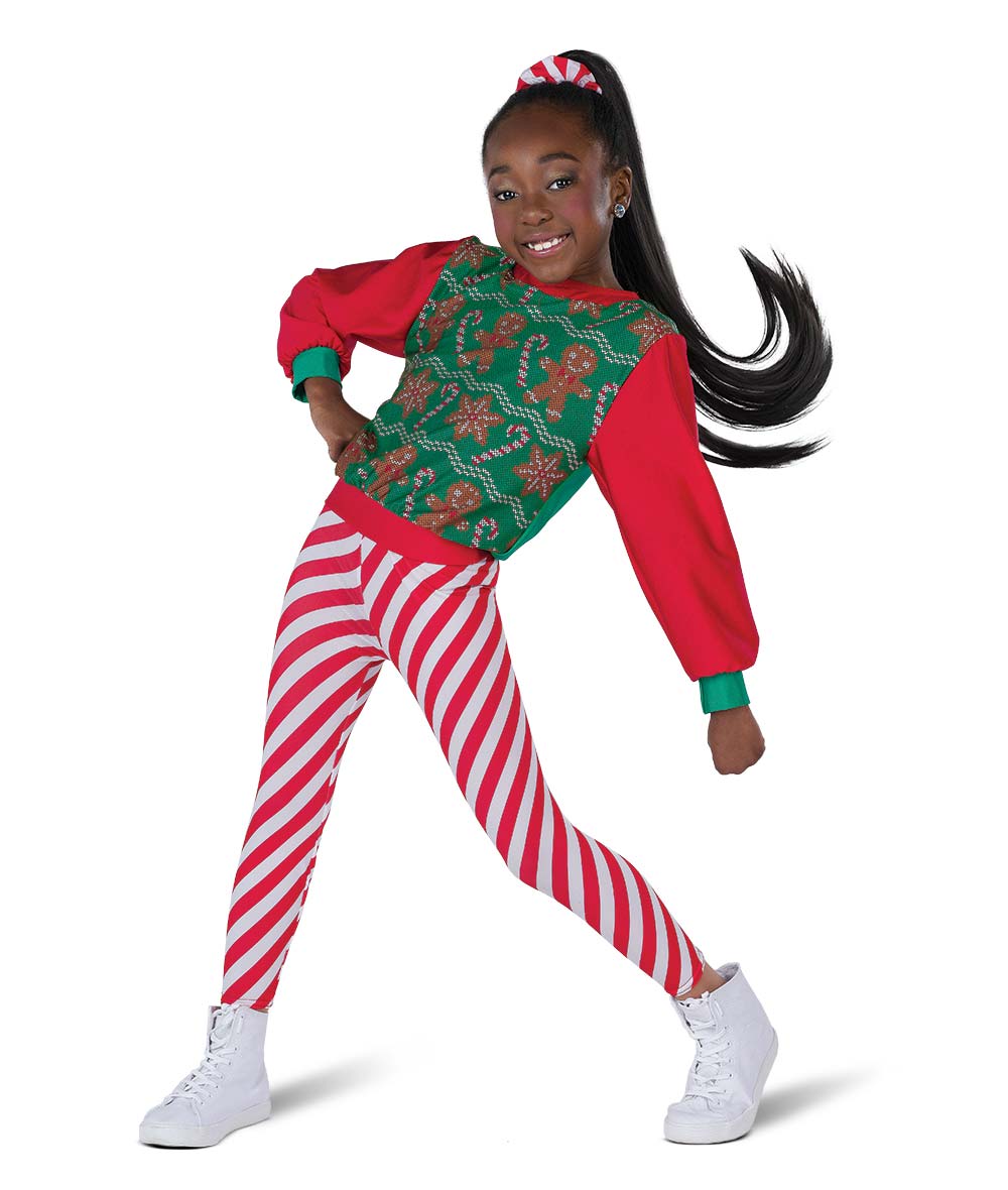 Paired with striking red and white striped spandex leggings that mimic a candy cane swirl, this look is energetic, playful, and full of personality. Whether dancing solo or in a group routine, this outfit makes a sweet seasonal statement.
