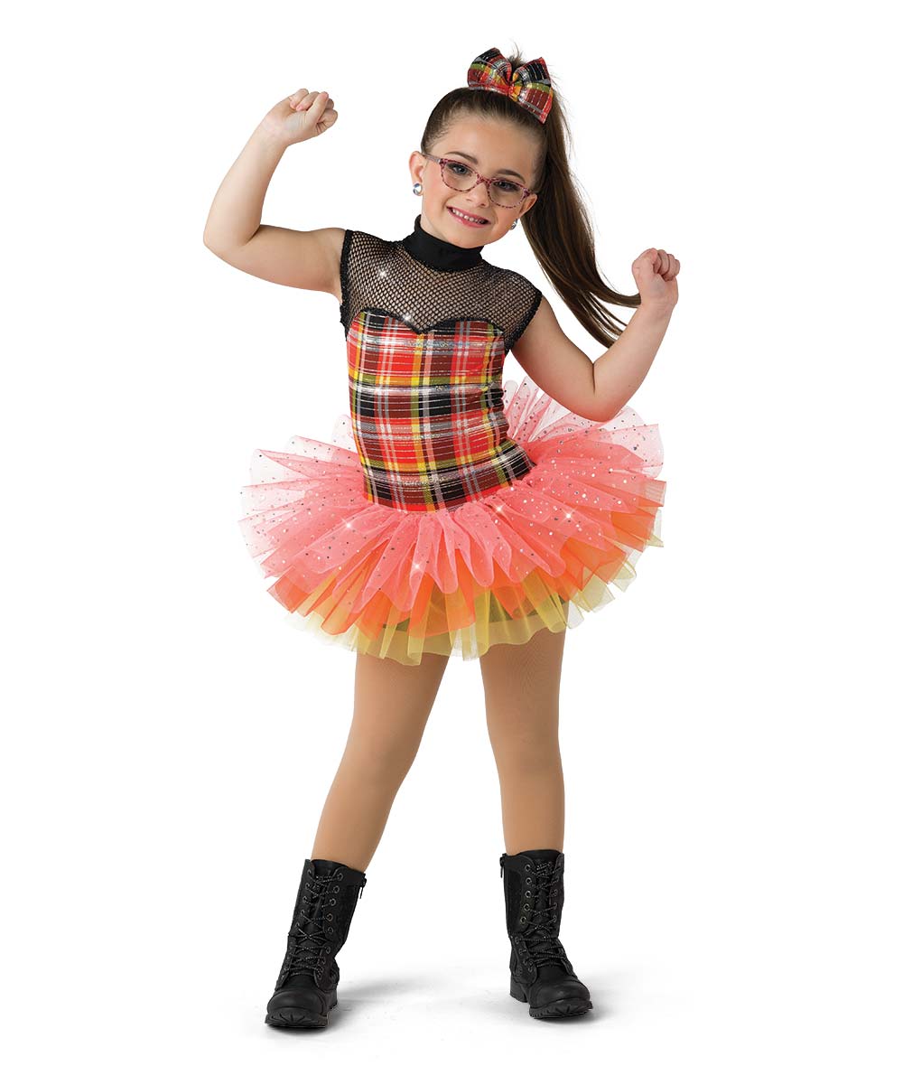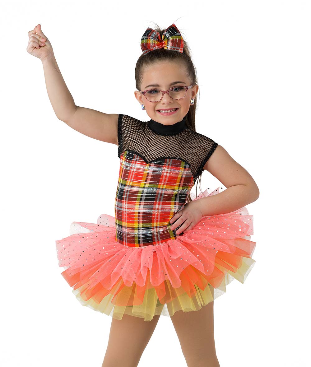 Plaid, solid spandex and glitter fishnet shortall with attached sequin dot tulle and organza tutu. Made in the USA.