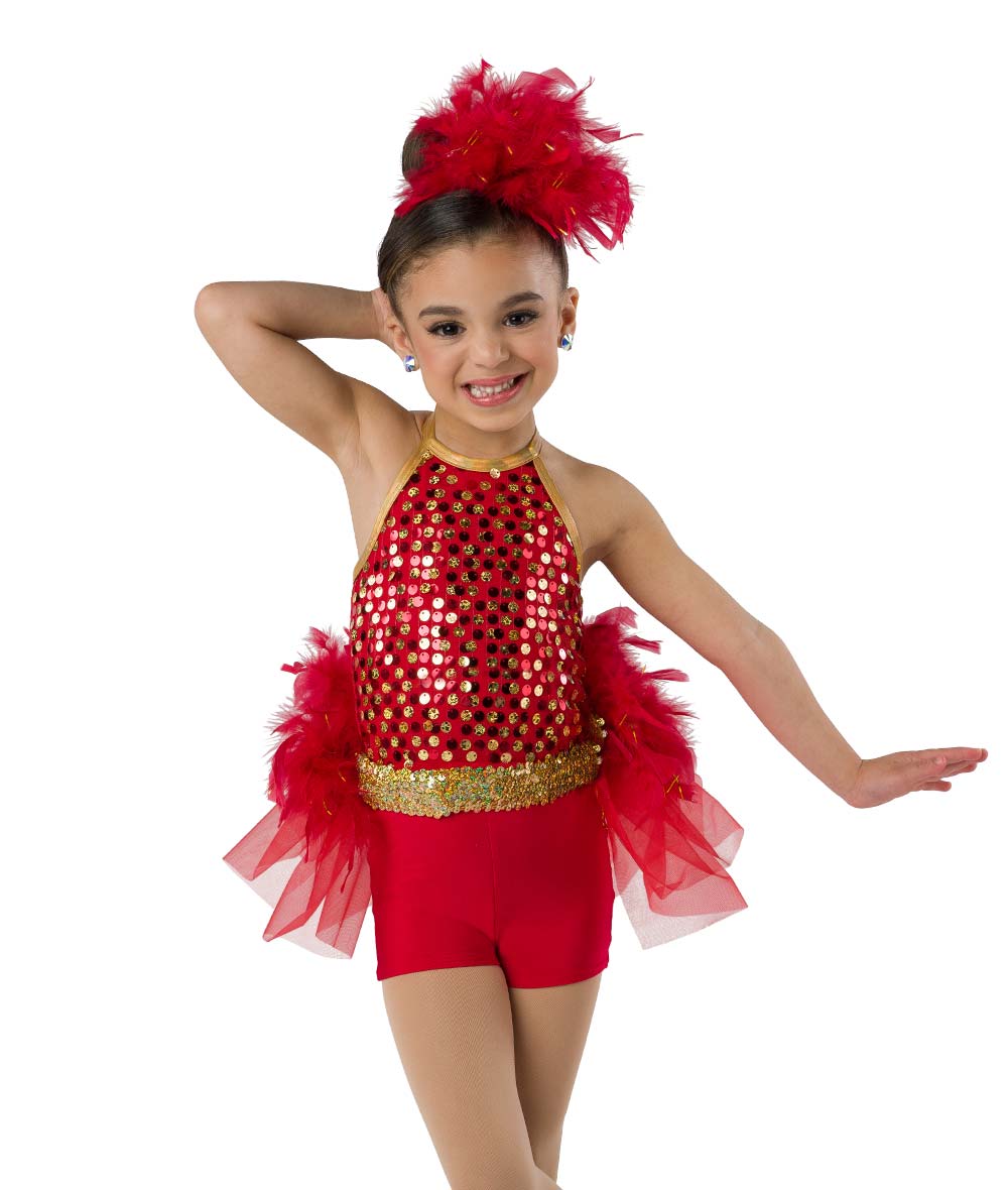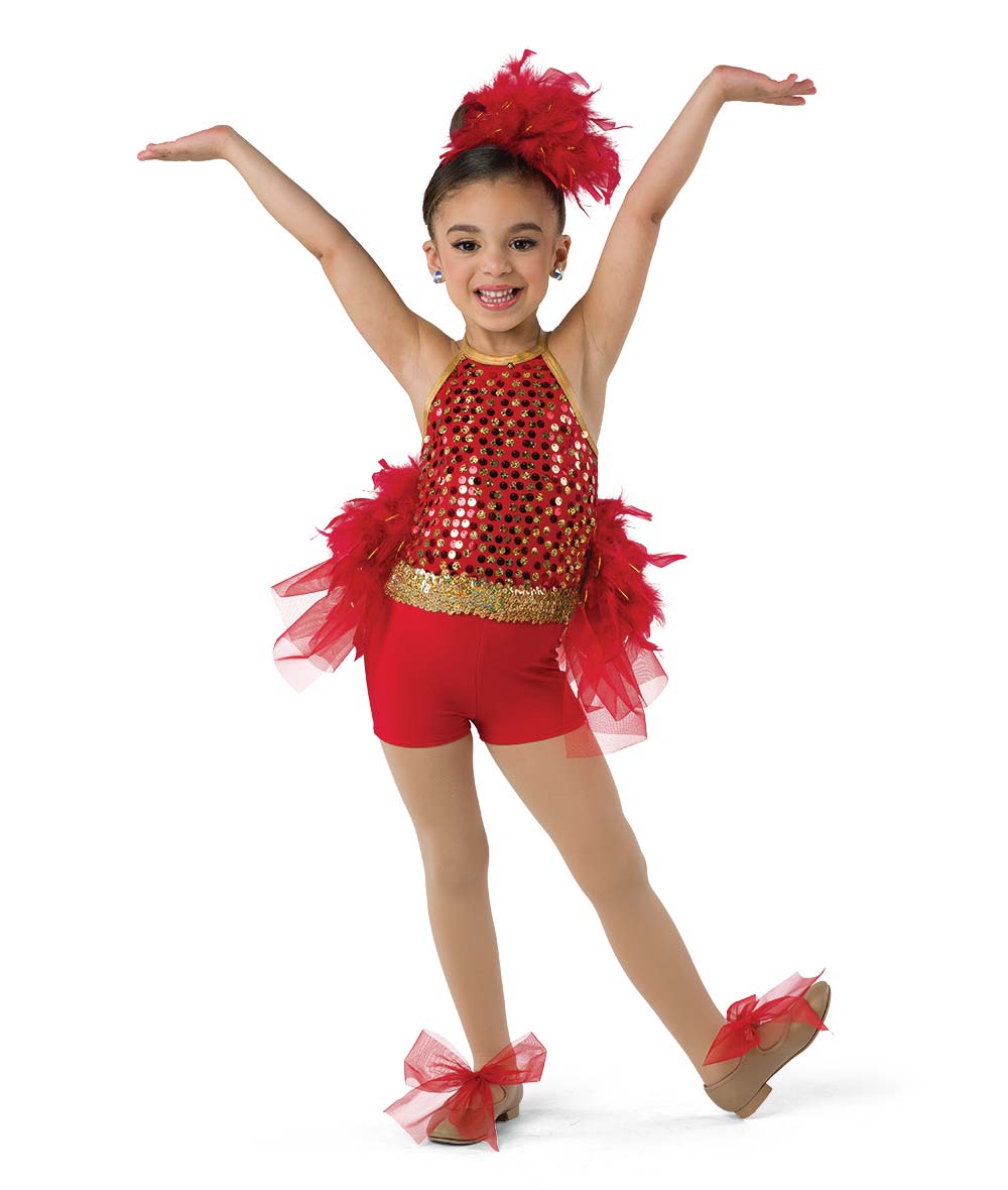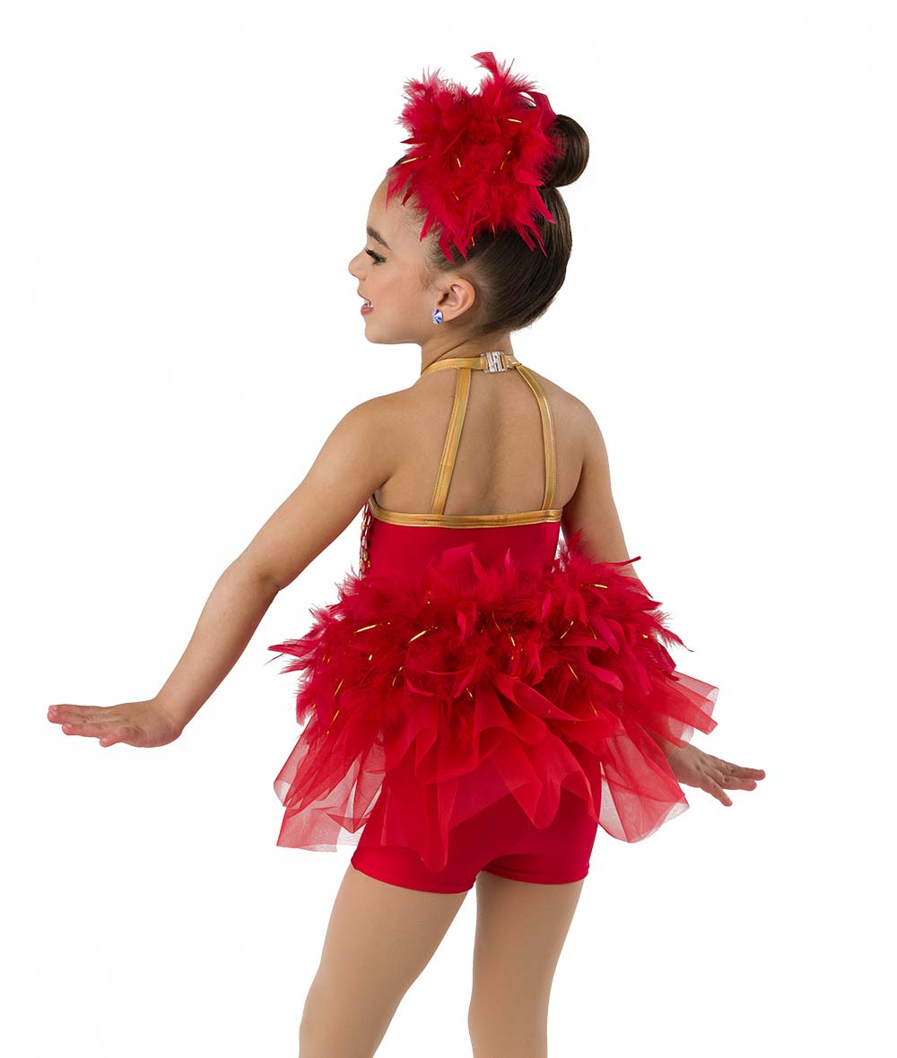 Lined paillette sequin mesh and spandex shortall with hologram foil lycra trim and sequin waistband. Attached flecked boa and organza back bustle. Shoe bows sold separately. Made in the USA.