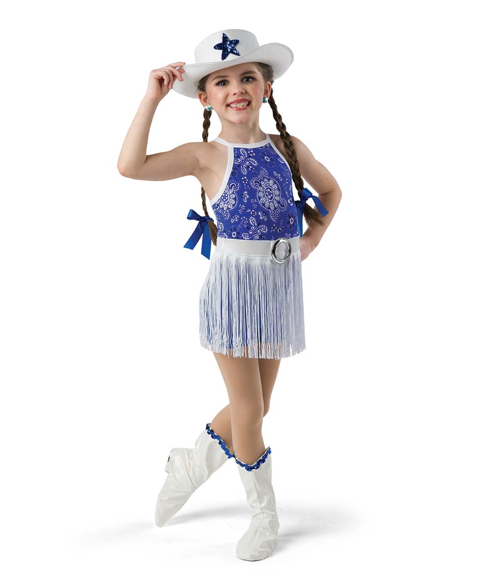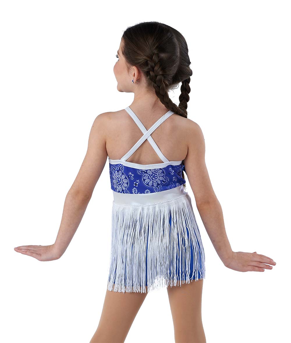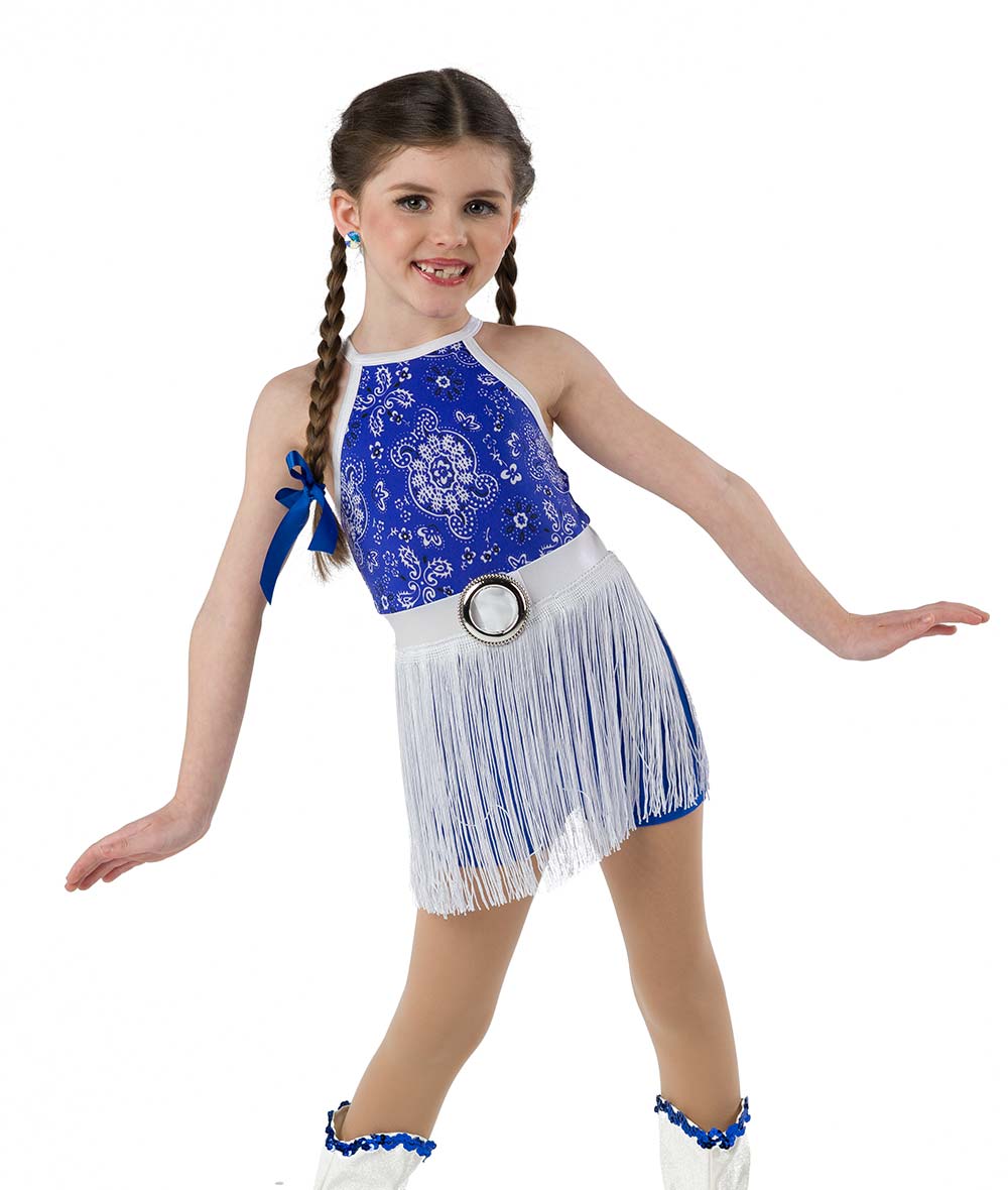 Bandana print and solid spandex shortall with foil lycra trim and belt buckle. Attached fringe skirt. Pattern may vary. Hat and boot covers sold separately. Made in the USA.