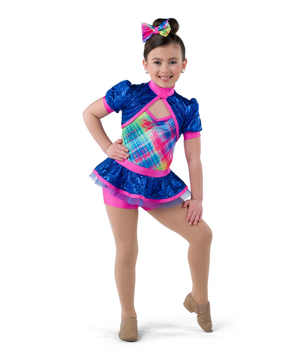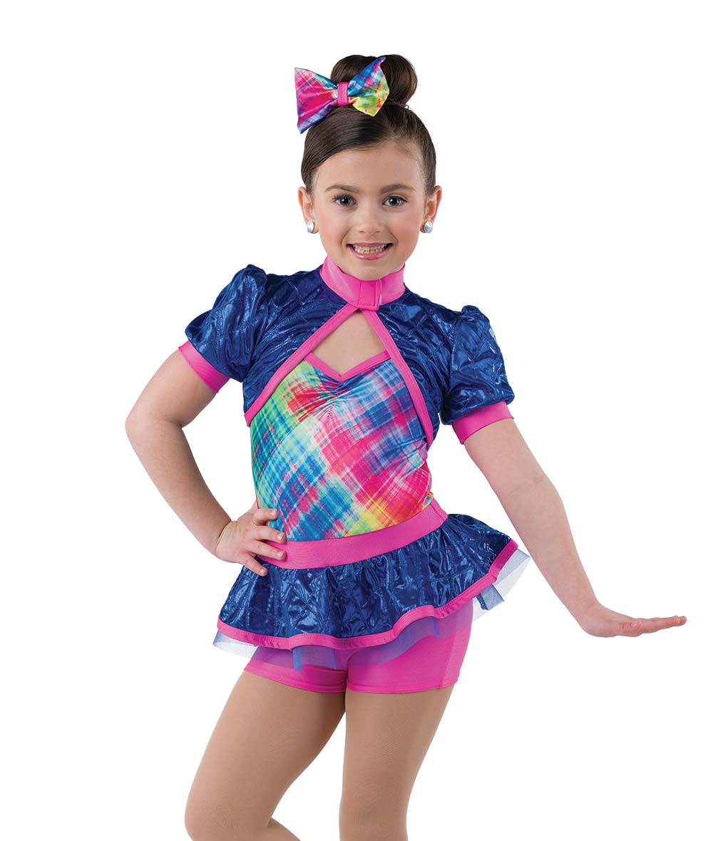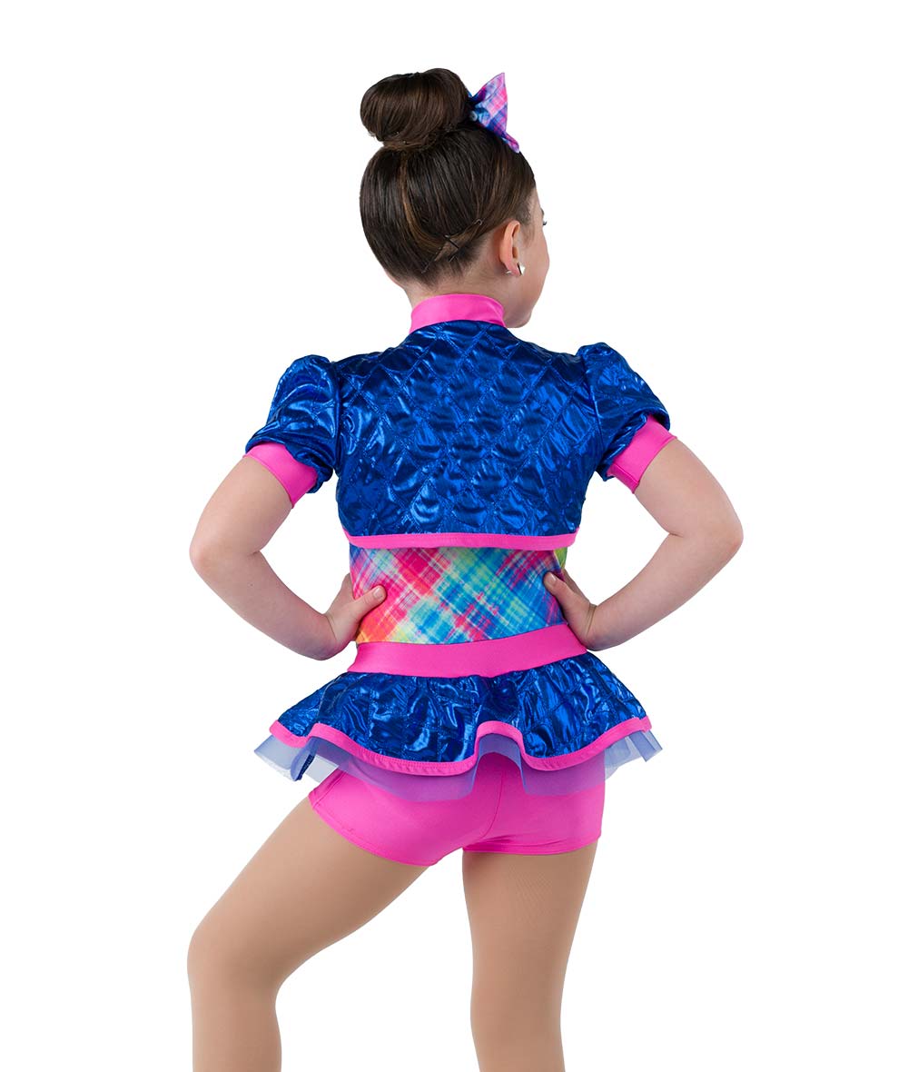 Rainbow plaid and solid spandex shortall with foil quilted and organza peplum. Foil quilted crop shrug with spandex trim and velcro closure. Made in the USA.