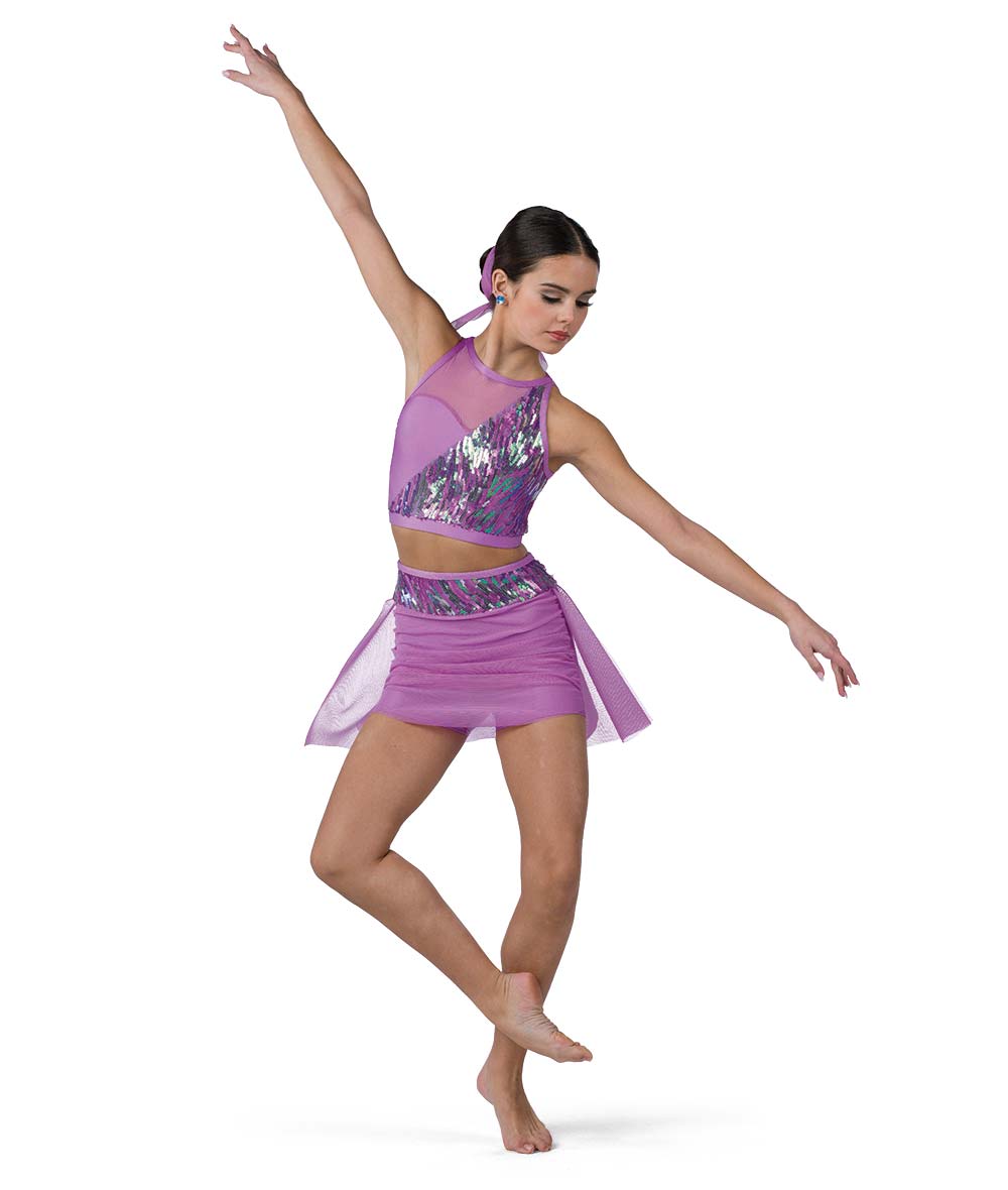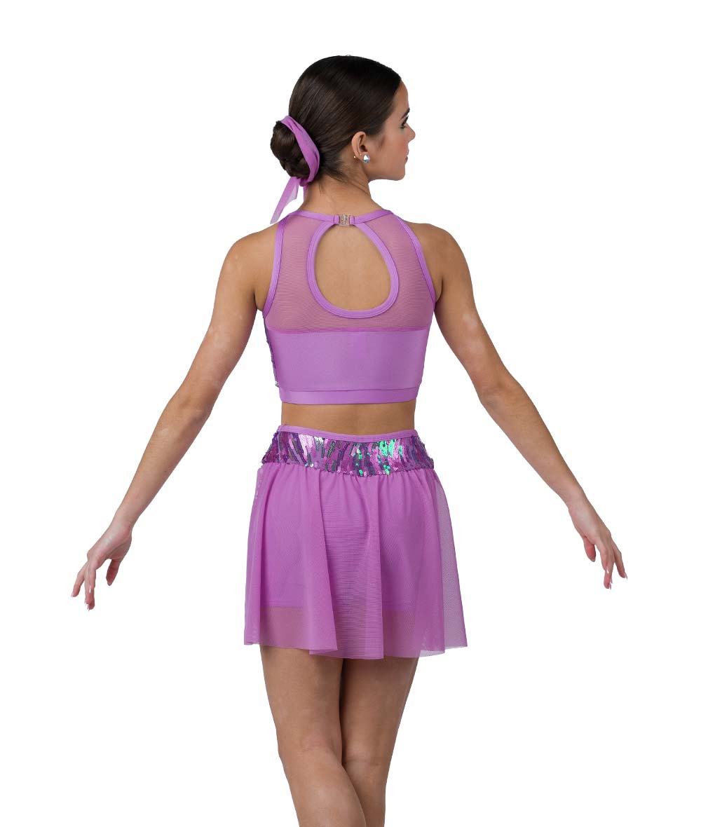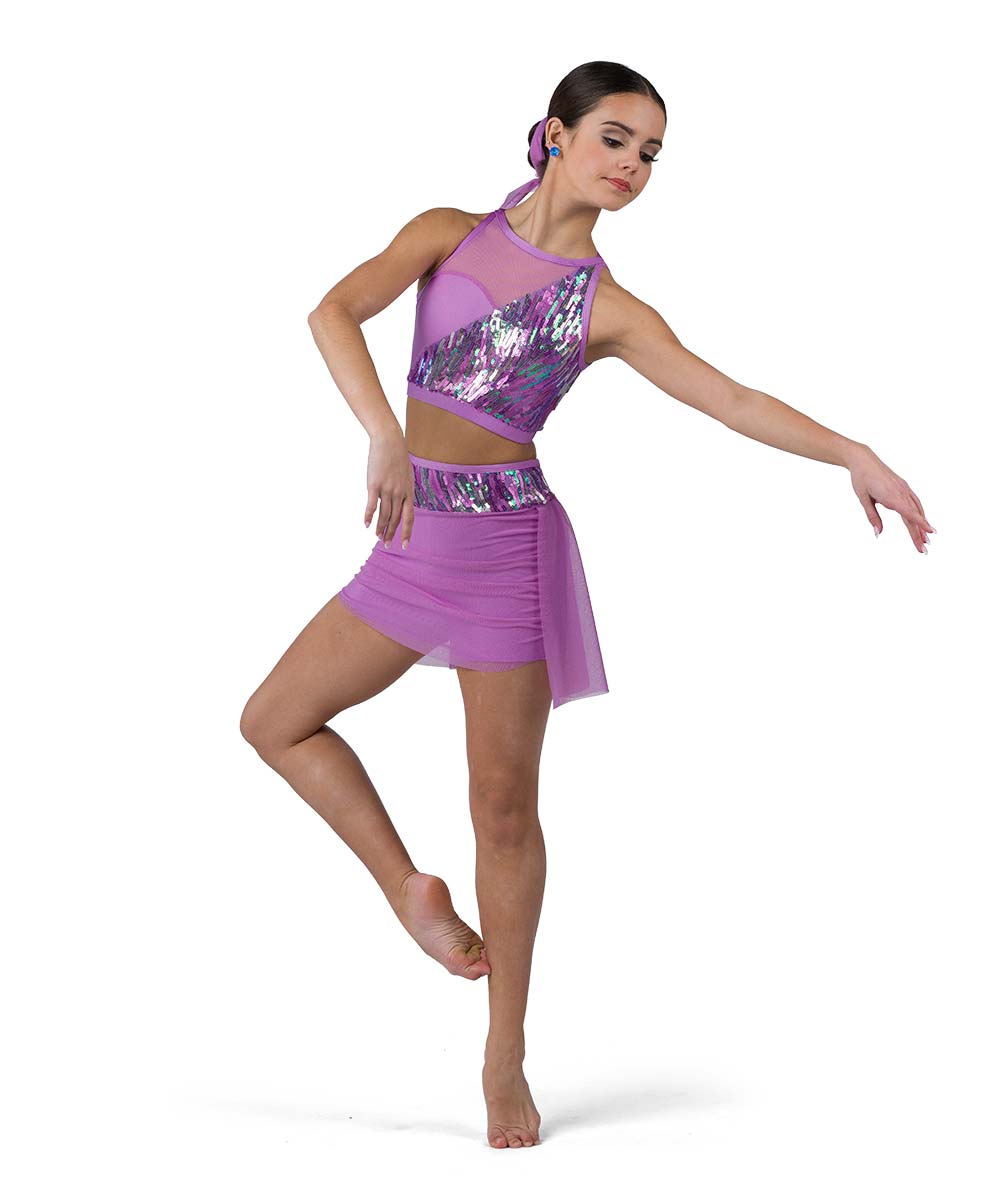 Lined multicolor sequin, solid mesh and spandex crop top and draped skirt over attached hot pants. Made in the USA.